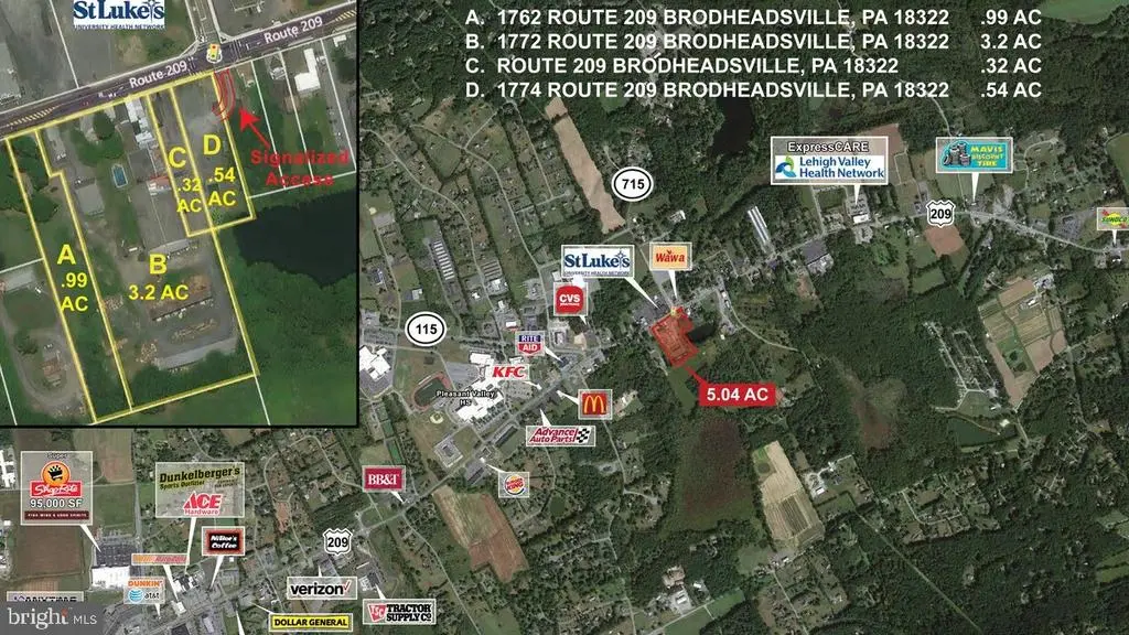 Property is four parcels (1762-1774 Route 209 in Brodheadsville), +/- 5 Acres and is situated at signalized intersection of Rt. 209 and Rt. 715. Traffic counts in excess of 18,000 VPD.